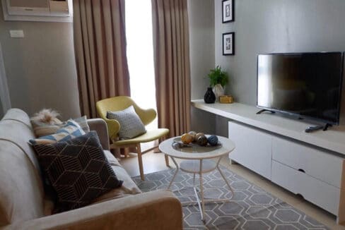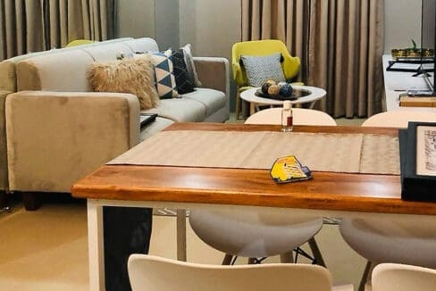 The living area is thoughtfully designed with a plush sofa, an accent chair, and elegant décor, creating a warm and inviting ambiance. Large windows allow plenty of natural light to brighten the space, enhancing its airy and sophisticated feel. Whether you’re unwinding after a long day or entertaining guests, this living area provides the perfect setting.