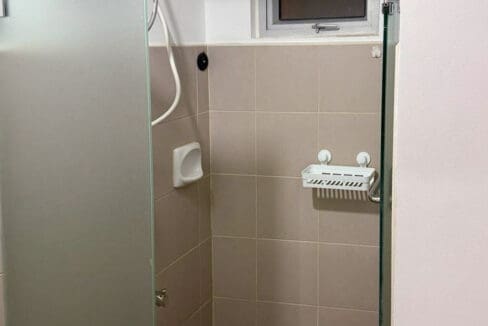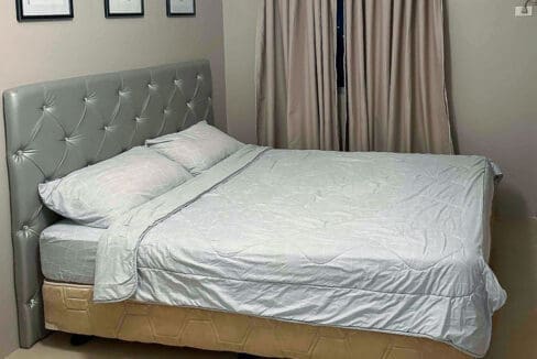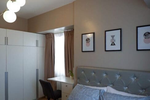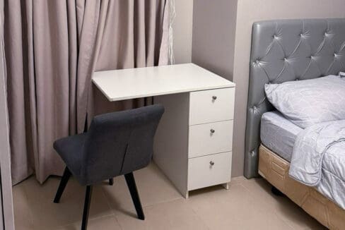 The spacious bedroom features a comfortable bed with a tufted headboard, a built-in wardrobe for ample storage, and a study nook ideal for working from home. Soft lighting and stylish accents add to the relaxing atmosphere, ensuring restful nights. The modern bathroom boasts high-quality fixtures, a glass-enclosed shower, and a water heater for added convenience.