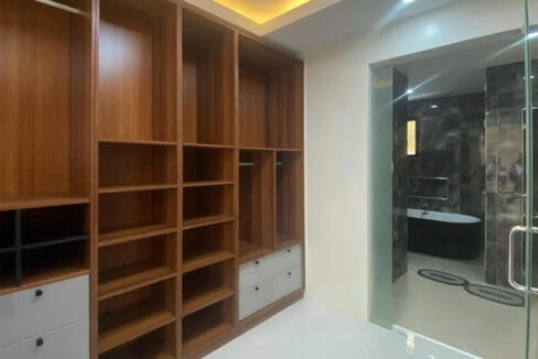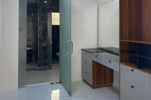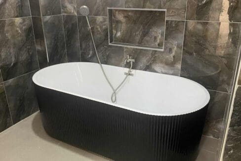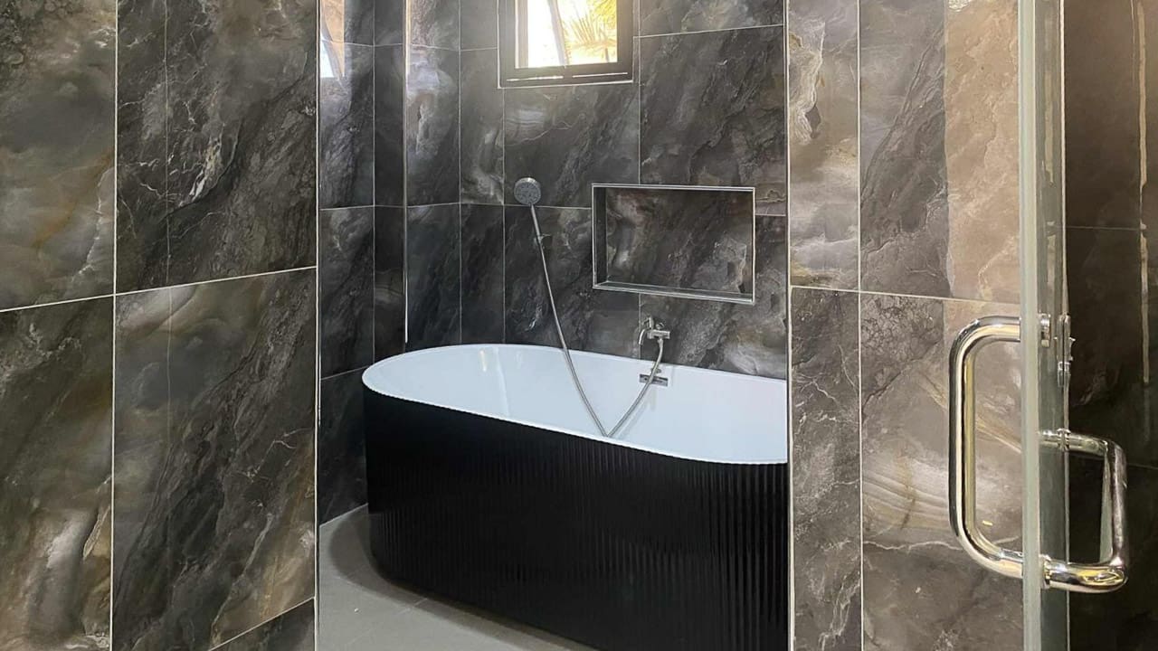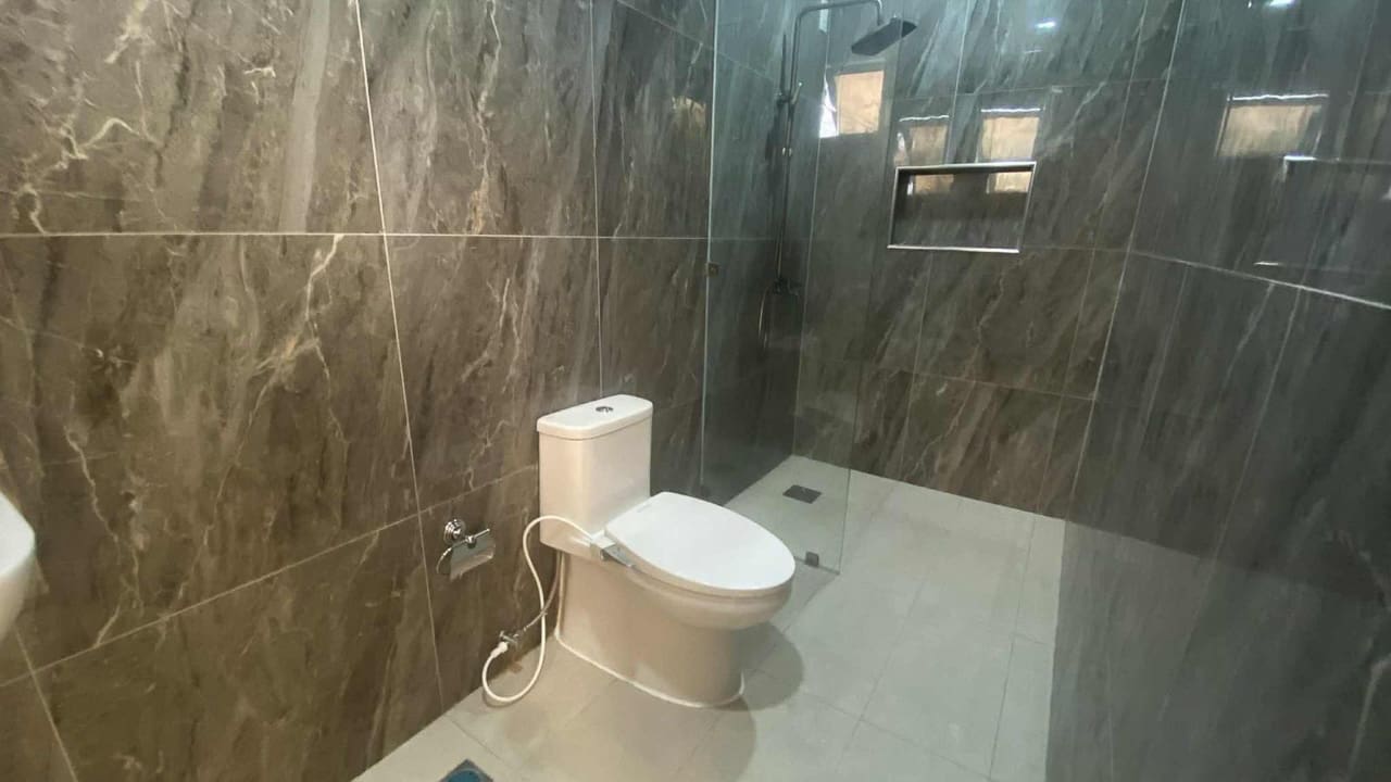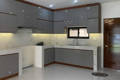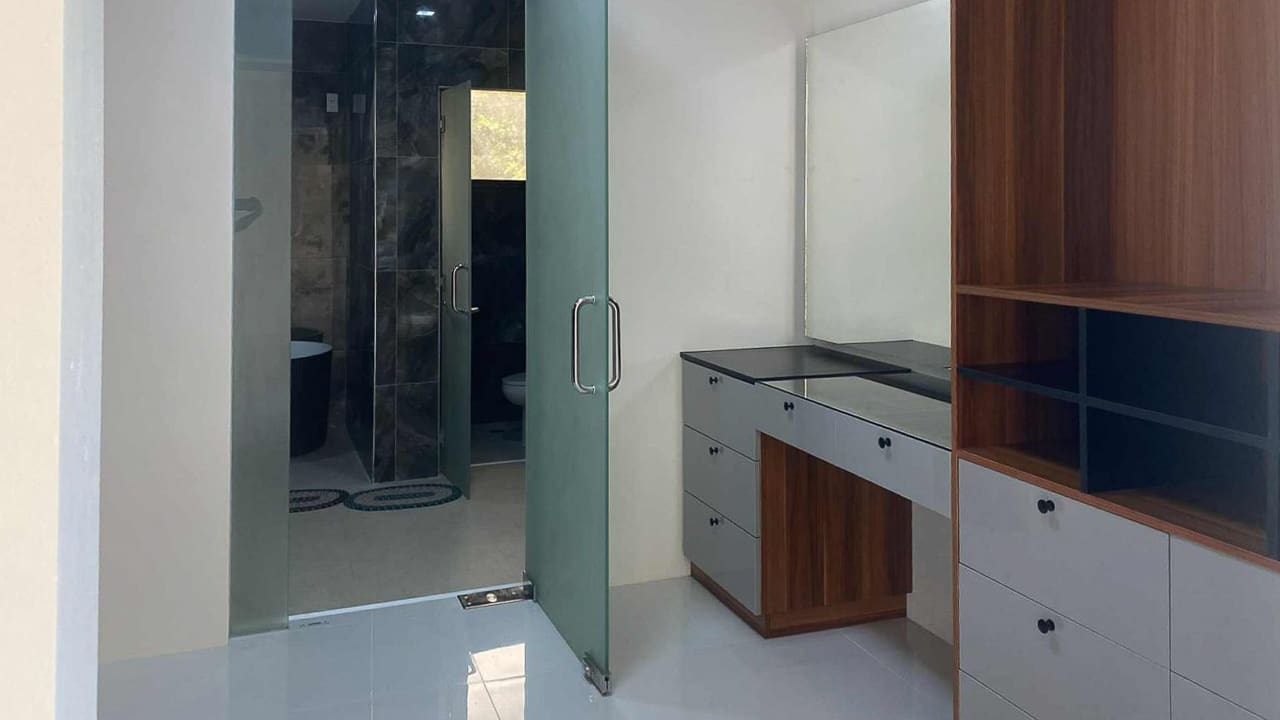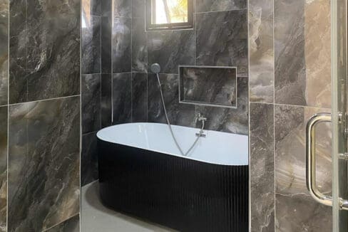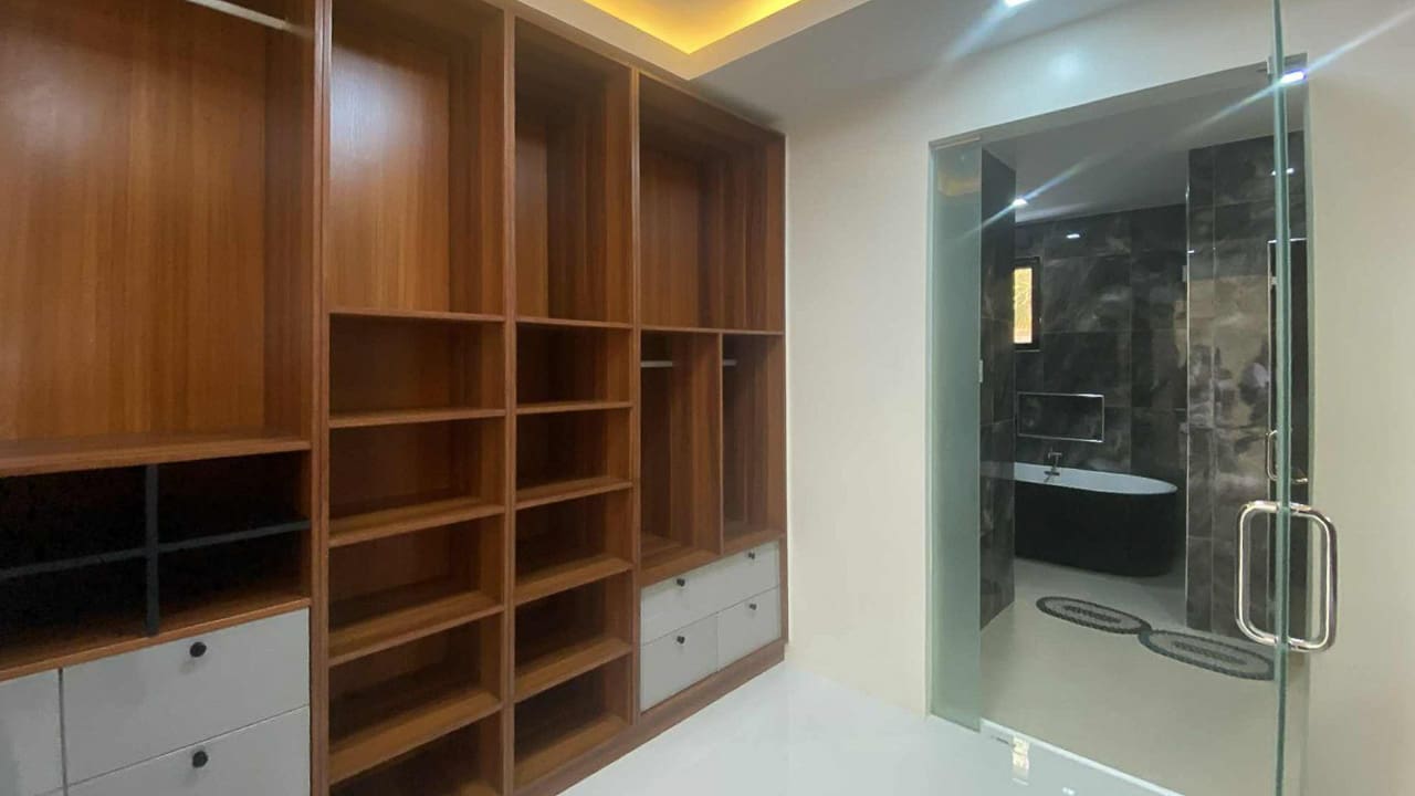 The heart of this new Consolacion home is undoubtedly its gourmet kitchen. A chef’s dream, it is impeccably designed with sleek, handleless grey cabinets, premium marble-patterned countertops, and a functional breakfast bar. Ascend the sculptural staircase to the private quarters upstairs, where the master suite serves as a true sanctuary. The level of detail in this newly built property is evident in the master suite, which features a spacious walk-in closet and a spa-inspired en-suite bathroom, complete with a luxurious freestanding tub set against a backdrop of dramatic, dark marble-style tiles.