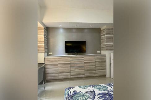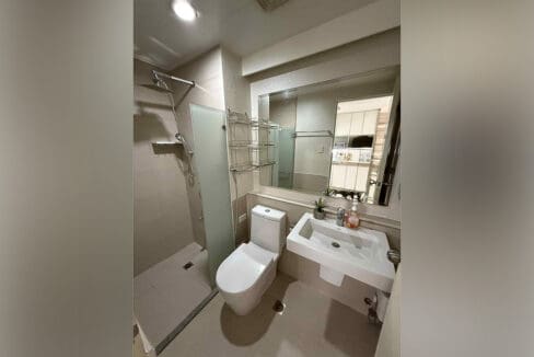 First, the living and sleeping area provides a calm place to rest, with a beautiful headboard and built-in lighting. Across from the bed, a long media console gives you plenty of storage and a clean look. Next, the workspace by the window offers a front-row seat to the amazing city skyline. Therefore, it is a great spot for working or enjoying a meal. Beside the living area, the kitchen shows off its smart use of space with modern appliances and many cabinets. Likewise, the bathroom is just as great, with a modern walk-in shower. In the end, this smart combination of style and function makes this a truly Chic Luxury Modern Studio with Breathtaking City Views. If you're interested in a studio for sale in Calyx Center, this property is a must-see.