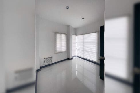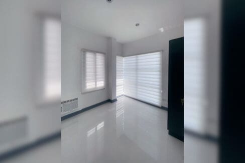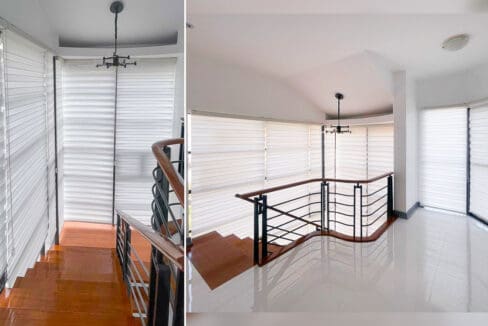 Upstairs, you’ll find four spacious bedrooms with large windows and sleek blinds, offering privacy while maintaining a light-filled ambiance. The polished white floors, dark trim accents, and minimalist lighting fixtures create a cohesive look throughout the home. The stairway, adorned with warm wooden steps and a matte black railing, adds a striking architectural feature.