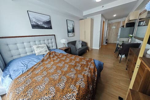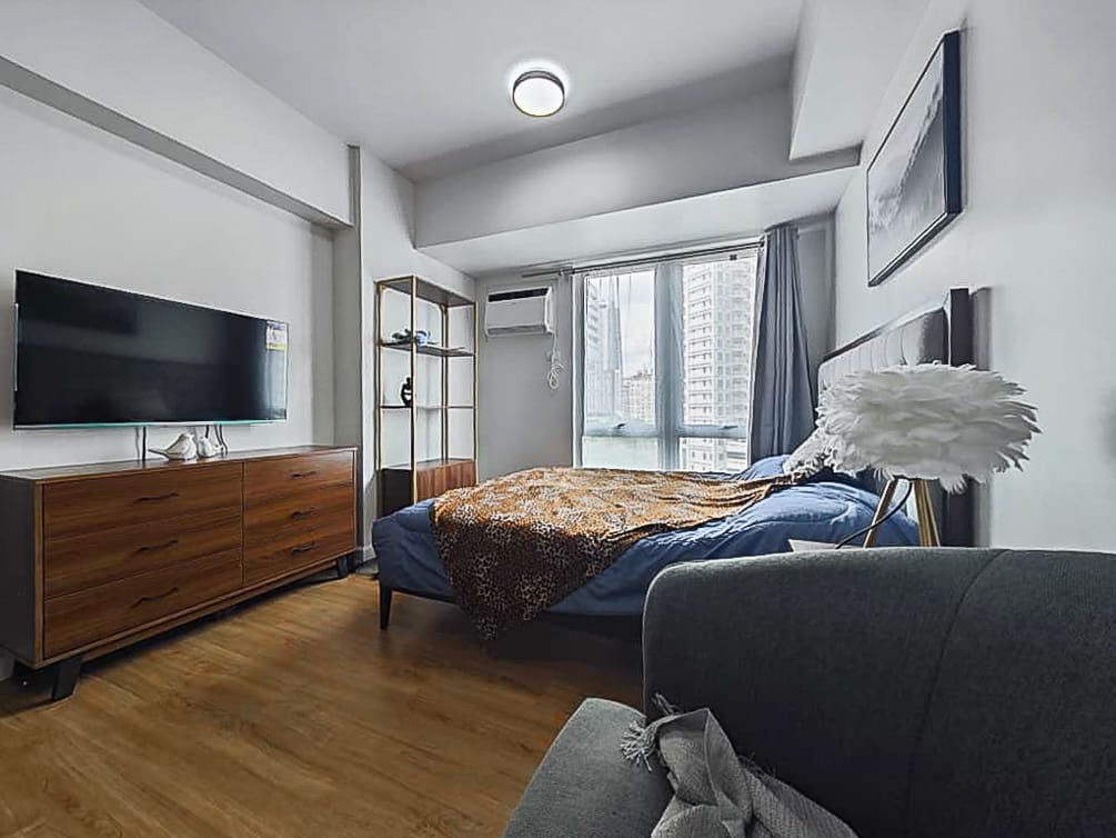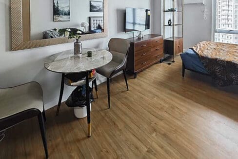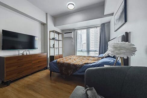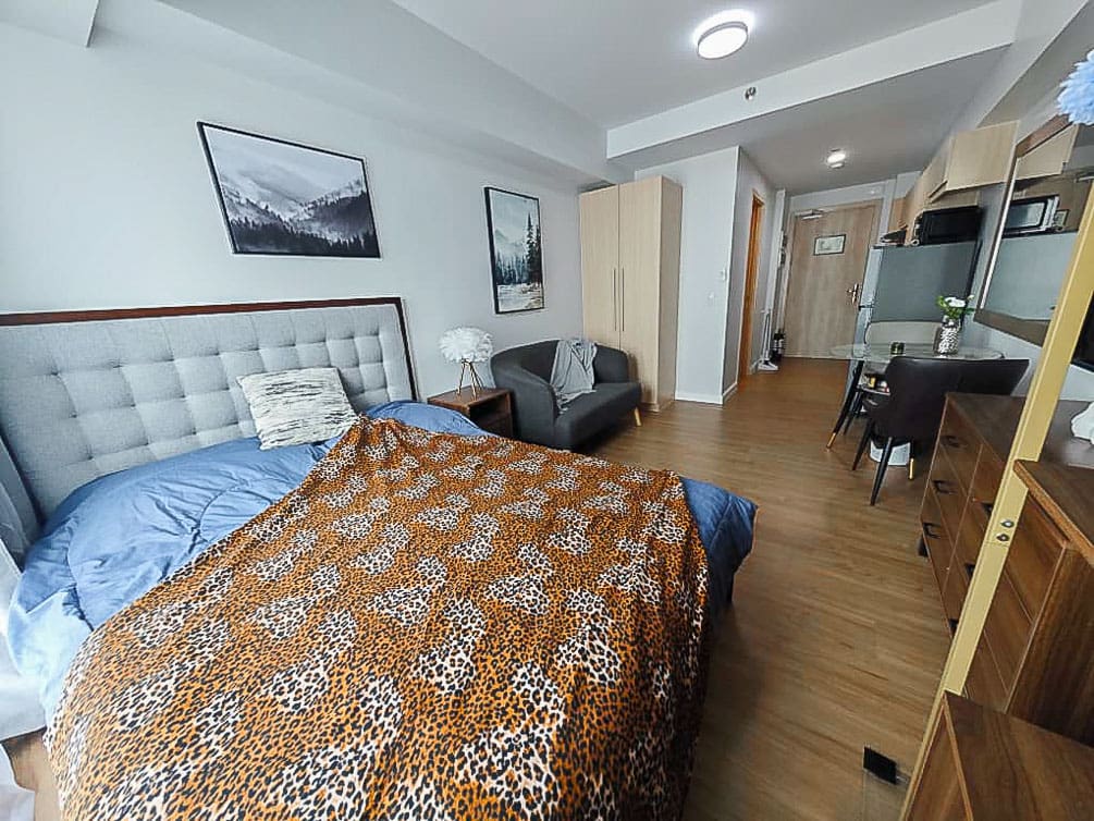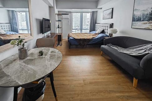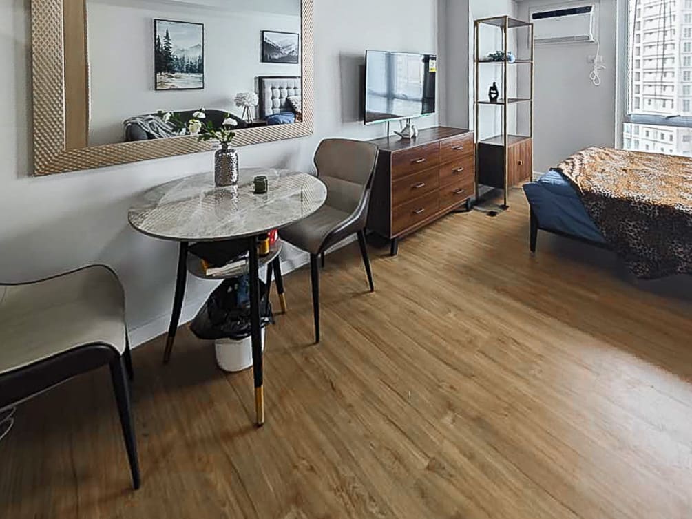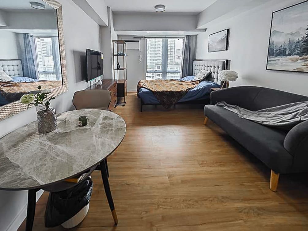 The unit is thoughtfully furnished with a queen-sized bed, a comfortable sofa, a wall-mounted TV, and a compact dining set. Large windows allow abundant natural light and provide relaxing city views, while neutral tones and wood-look flooring create a warm and inviting atmosphere. If you’re looking for a move-in-ready home near Ayala Center Cebu, this Cozy Furnished Studio Condo in Solinea Tower 4 delivers both comfort and location.