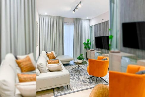 The living area is designed for calm, with plush seating, elegant lighting, and curated décor elements that blend modern style with cozy warmth. A soft sectional anchors the room, complemented by layered textiles and a statement chair in burnt orange—a bold touch that reflects the unit’s distinct personality. Large windows draped with flowing curtains allow natural light to softly filter in, adding a radiant glow throughout the space.