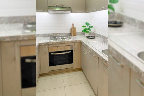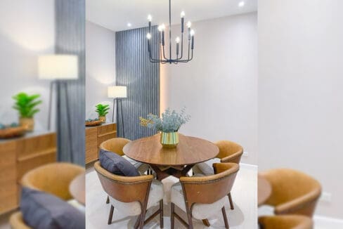 Connected seamlessly to the living area, the dining nook features a beautifully set round table under a striking chandelier. It’s a corner that turns daily meals into memorable moments. The kitchen is clean and compact, equipped with sleek cabinetry, granite countertops, and modern appliances that make every task feel easy and efficient.