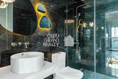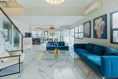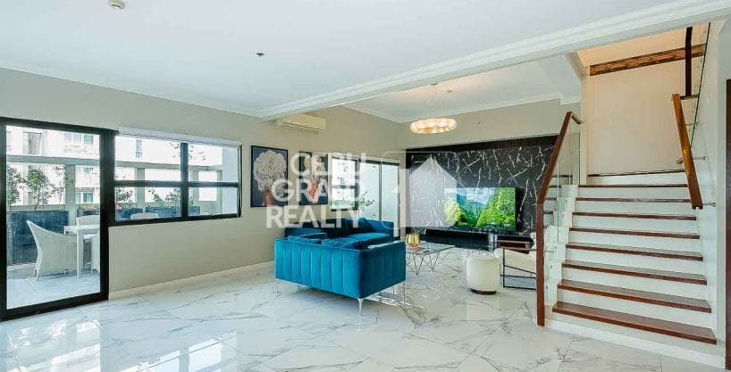 Welcome to your dream home in Cebu City! This luxurious penthouse features a spacious open-plan kitchen and dining area, complete with black marble countertops, elegant chandeliers, and high-end stainless steel appliances. The adjacent living area, highlighted by a gray sectional sofa and large windows, is flooded with natural light. Step outside to the inviting outdoor seating area with wicker furniture, perfect for relaxation and entertaining. The elegant bedroom with a tufted headboard and wooden flooring offers a cozy retreat, while the simple yet functional beige bathroom adds to the condo's modern appeal.