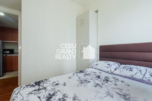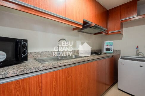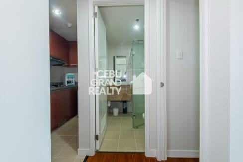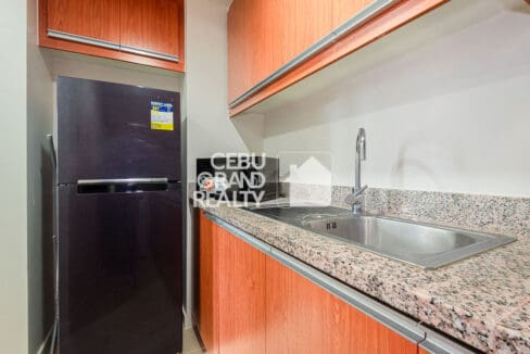 The enclosed kitchen is compact and efficient, fitted with wooden cabinets, granite countertops, a built-in cooktop with range hood, refrigerator, microwave, and washing machine. The bedroom offers a relaxing retreat with a padded bed, built-in wardrobe, and large window with curtains for natural light and privacy. A modern bathroom with a glass-enclosed shower and marble vanity completes this Exclusive 1 Bedroom Condo for Rent in Marco Polo Residences, making it a move-in-ready residence in Lahug.