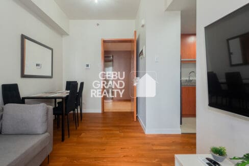 The living and dining area is thoughtfully designed for comfort and functionality. This Exclusive 1 Bedroom Condo for Rent in Marco Polo Residences comes with an L-shaped sofa, a wall-mounted flat-screen TV, and a dining table for four. Neutral tones, clean lines, and a split-type air-conditioning unit create a warm and inviting space suitable for professionals or long-term tenants seeking a quiet yet accessible home in Cebu City.