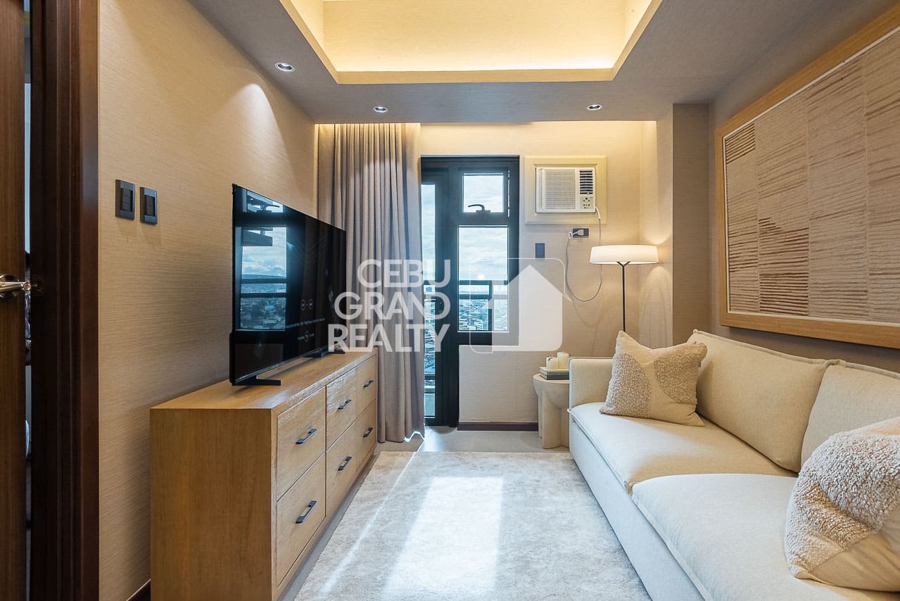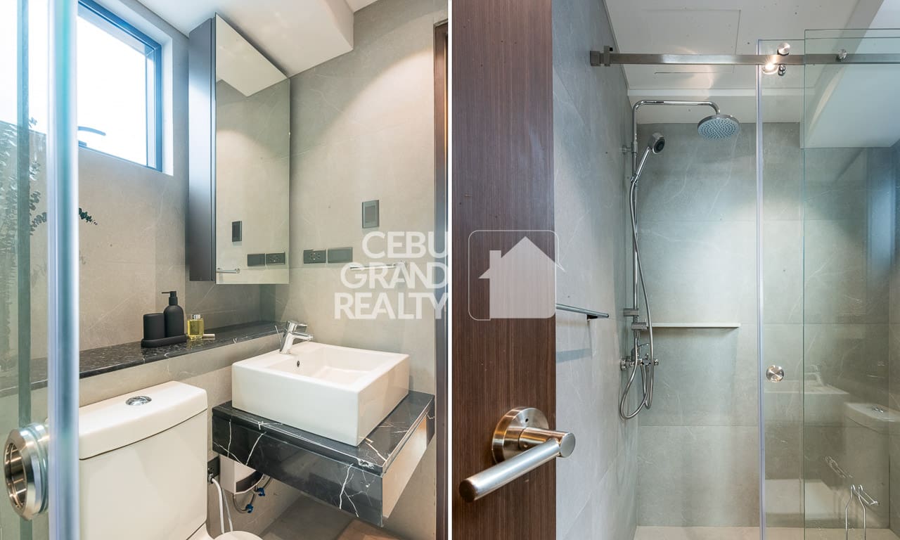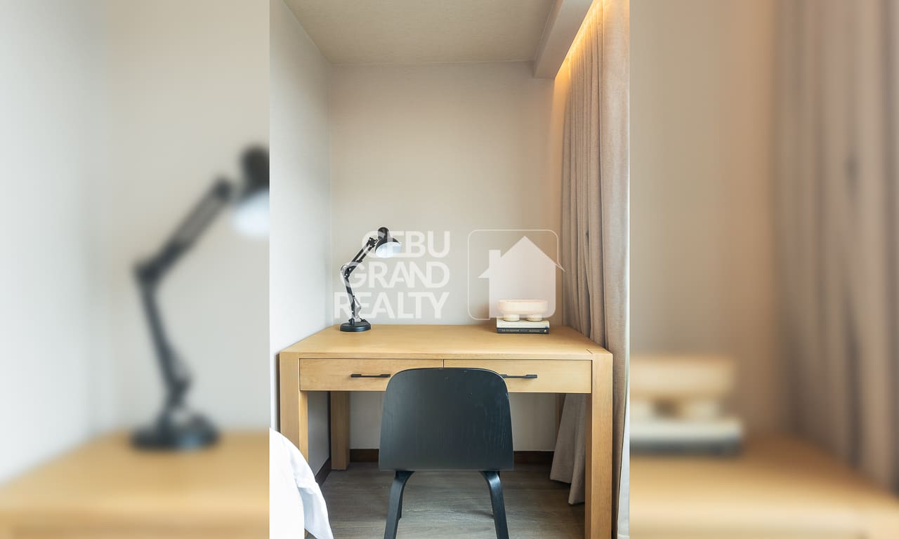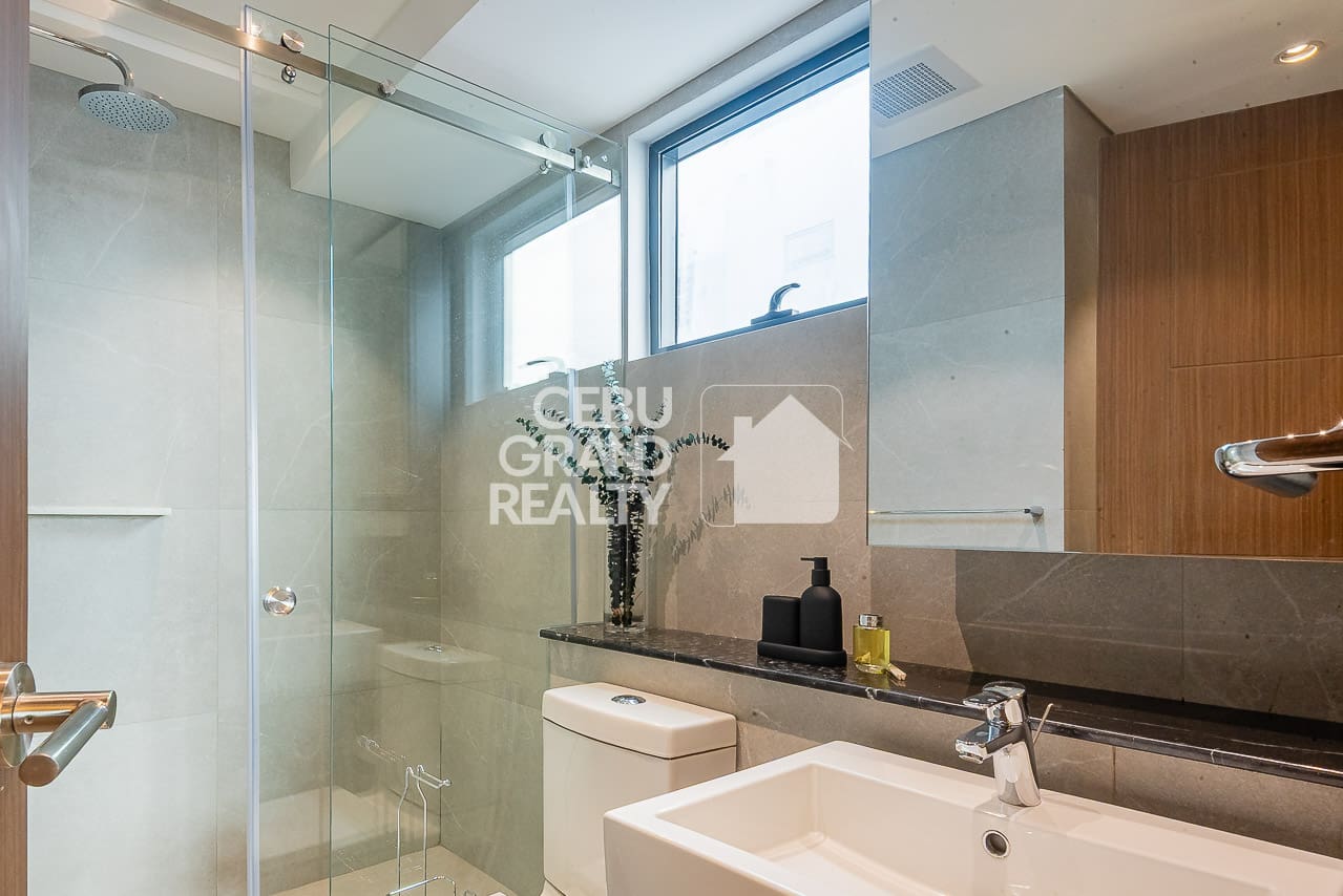 The private bedroom continues the sophisticated look. In this area, it boasts built-in wooden storage, quality bedding, and large windows. This is the exquisite condo for rent in Cebu you have been searching for. Finally, the beautiful bathroom features a glass-enclosed shower and high-end fixtures. Don't miss this chance to rent this Exquisite Modern Condo with Balcony and Panoramic City View. Thus, book a viewing and enjoy premier, hassle-free living today.