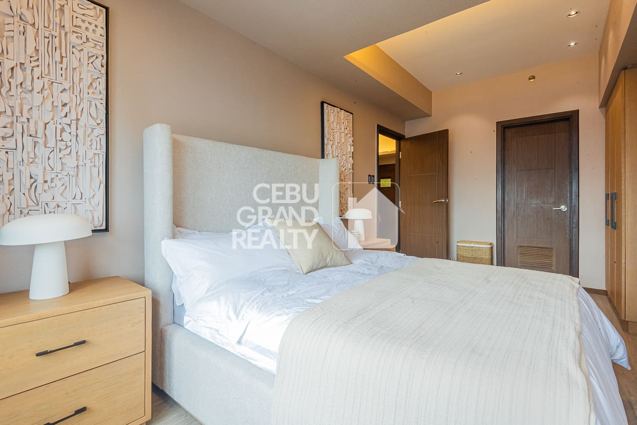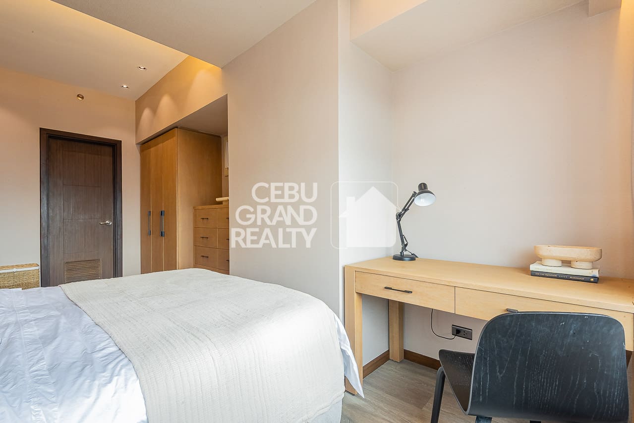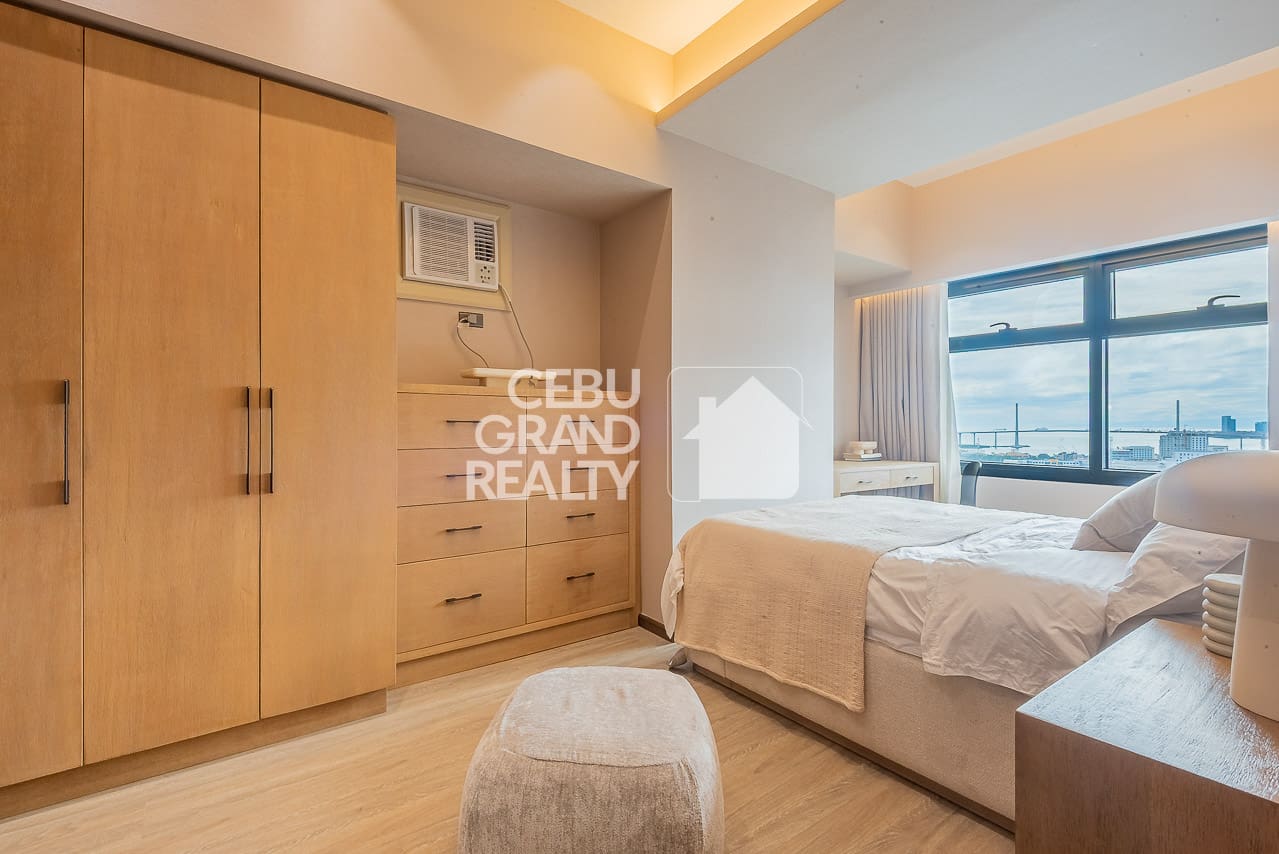 The private bedroom continues the sophisticated look. In this area, it boasts built-in wooden storage, quality bedding, and large windows. This is the exquisite condo for rent in Cebu you have been searching for. Finally, the beautiful bathroom features a glass-enclosed shower and high-end fixtures. Don't miss this chance to rent this Exquisite Modern Condo with Balcony and Panoramic City View. Thus, book a viewing and enjoy premier, hassle-free living today.