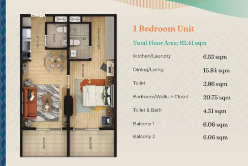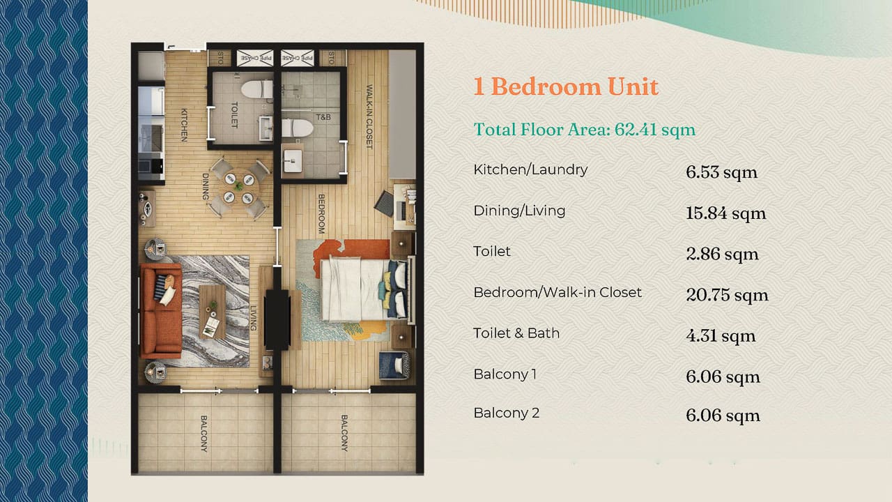 The unit itself is a masterpiece of spatial design. Specifically, it boasts a generous total floor area of 62.41 square meters. Unlike standard condo cuts, this property offers true room to breathe. The interior reflects the calmness of the ocean. For example, it features modern tropical finishes and warm wood textures. Furthermore, elegant lighting creates an inviting atmosphere day and night. A defining feature of this High-End Resort Condo with Ocean Vibe at Costa Mira is its dual outdoor spaces. Notably, it has two separate balconies totaling over 12 square meters. Consequently, you have ample room to enjoy the fresh coastal breeze.