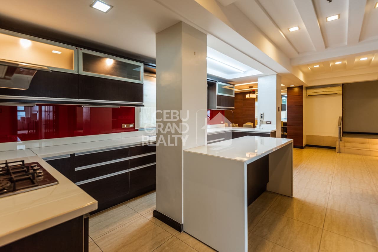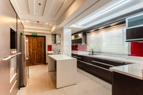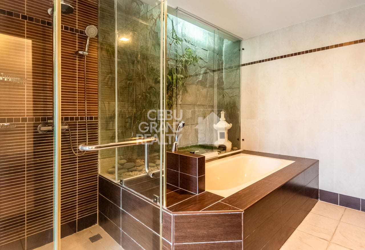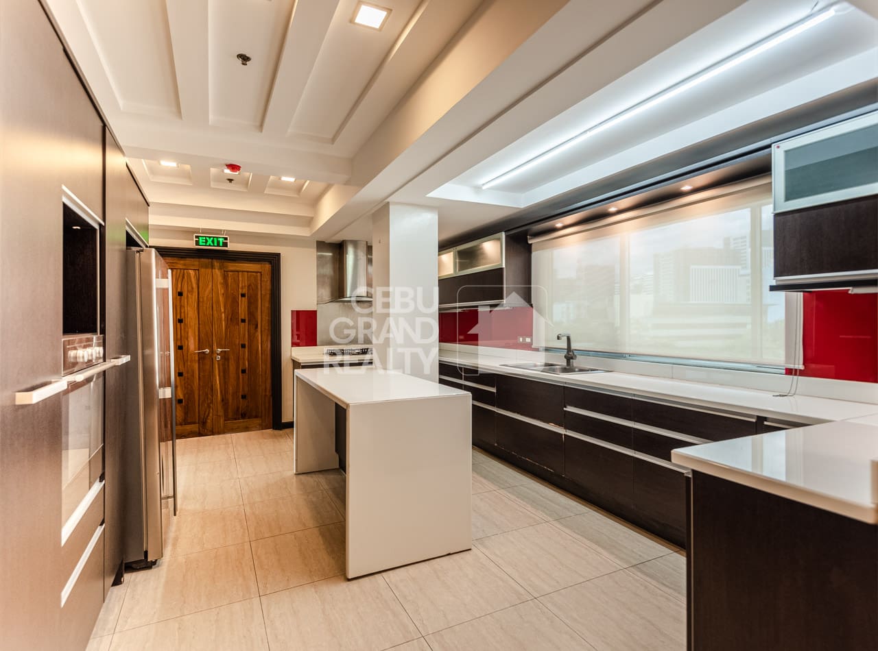 From the moment you enter, you will find large, open living spaces that flow nicely. The main lounge, for instance, has wide windows that frame the lively city. Meanwhile, a separate family area offers a cozy second spot with rich, polished hardwood floors. Adjacent to this, the modern kitchen is a cook's dream. It is fully-equipped with high-end dark wood cabinets, white counters, and a bold red glass backsplash. It also has a useful center island. In fact, it's designed for both casual meals and big parties. Beyond the living areas, each of the three bedrooms is a private space, especially the master suite. This quiet escape has a special bathroom. Here, it features a separate soaking tub, a glass walk-in shower, and a beautiful, light-filled zen garden. Truly, this Luxurious Modern Penthouse with Stunning Cebu Views is more than a home; it's a statement.