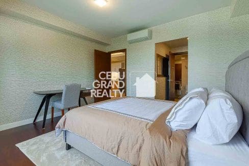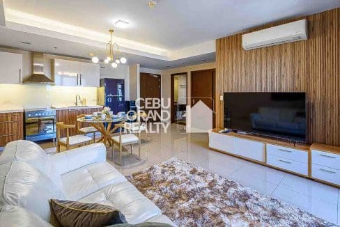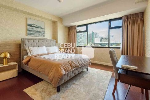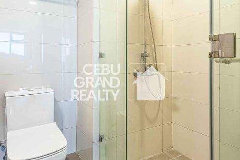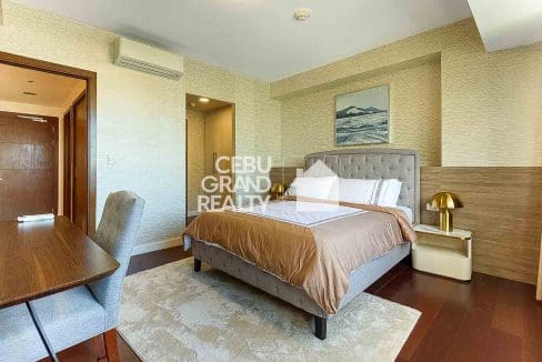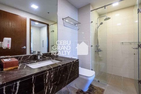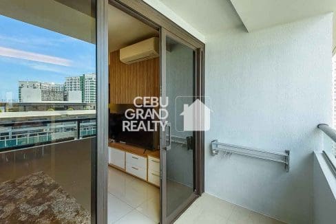 The bedroom serves as a private oasis with a tufted headboard and a dedicated workspace, while the en-suite bathroom boasts a glass-enclosed shower with a rain showerhead for a spa-like experience. Practicality meets luxury with thoughtful touches like a retractable drying rack on the balcony, making this condo the perfect blend of style and convenience in the heart of Cebu.
