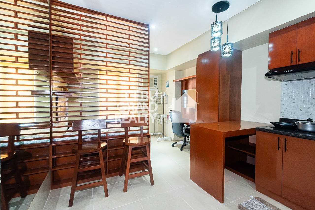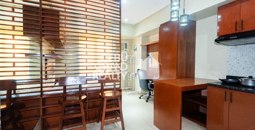 Once inside, the smart, open-plan layout highlights warm wooden textures. For instance, a stylish wood-slat partition separates the sleeping quarters from the living area. Consequently, this ensures privacy without blocking natural light. Furthermore, the sleeping area includes a functional trundle bed and overhead storage. In addition, the workspace features a built-in desk and wall-mounted TV. Thus, this Modern and Cozy Studio at Avida Towers Riala with City View serves as an ideal work-from-home setup. Also, the kitchen boasts a cooktop, range hood, and refrigerator. Moreover, it connects to a custom dining bar where a large mirror visually expands the room.