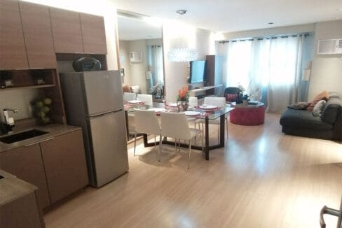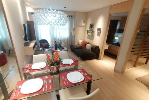Step into a modern condo with stylish interiors in Cebu, designed to offer both comfort and functionality. This well-appointed unit features a sleek open-plan layout that connects the dining, living, and kitchen areas seamlessly. A glass dining table, contemporary lighting fixture, and warm wood flooring set the tone for upscale urban living. Natural light filters through the large windows, giving the space a bright and airy feel.