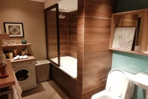 The bedroom is cozy yet sophisticated, separated by a frosted glass partition that adds privacy without compromising the open ambiance. It comes complete with a plush bed, side tables, and a mounted TV. A dedicated work nook with a desk and office chair makes it easy to work from home. The bathroom is spa-inspired, featuring wood-look tiles, a soaking tub with rainfall shower, and even an in-unit washer for added convenience.