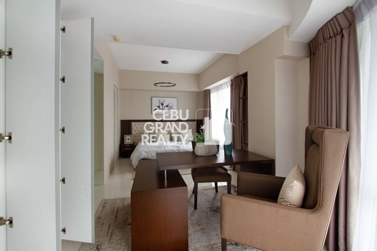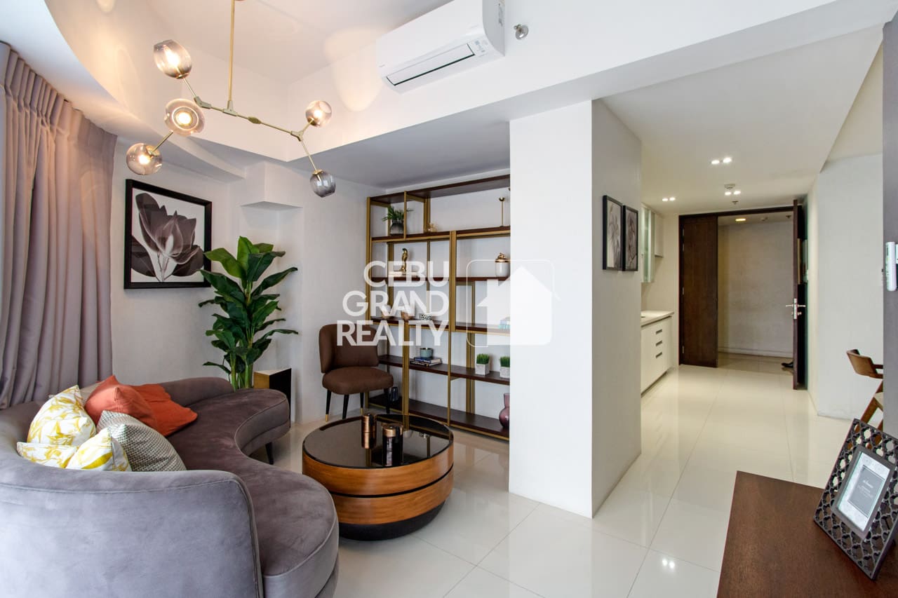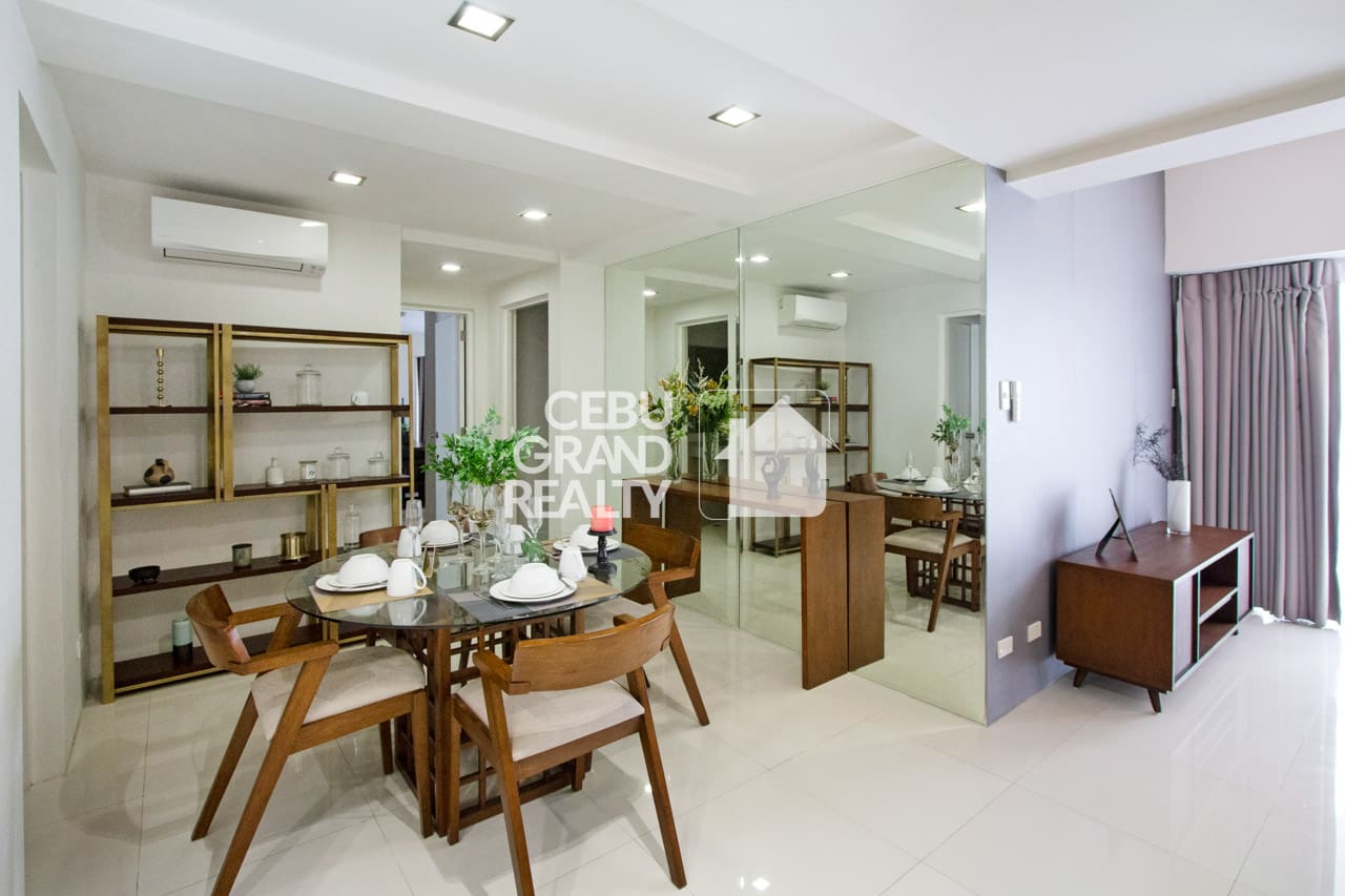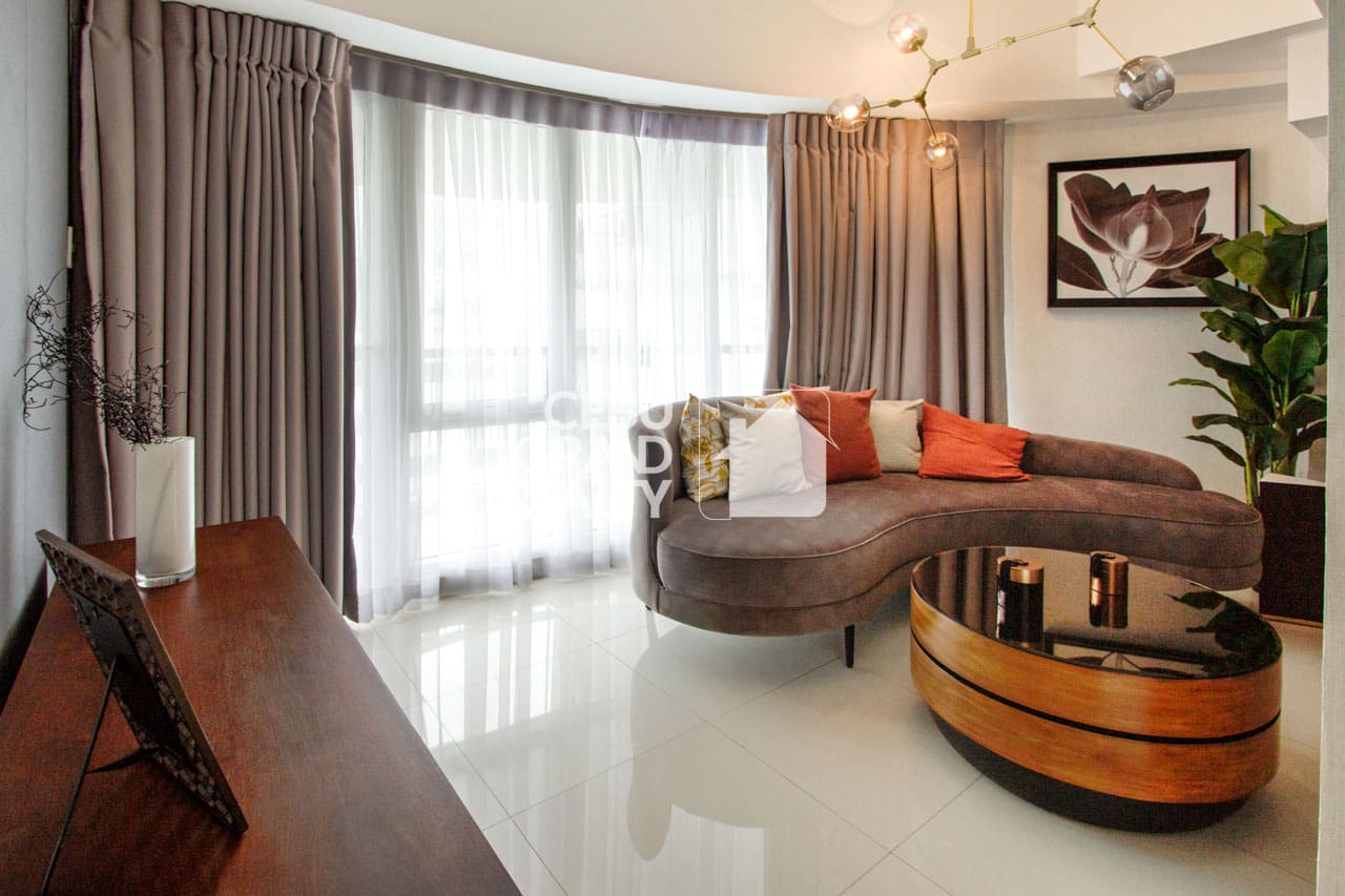 The intelligently designed open-plan layout promotes a seamless flow between the living, dining, and kitchen areas, making it ideal for both intimate relaxation and entertaining guests. The main living space is anchored by a gracefully curved sofa, a true centerpiece for conversation and comfort. In the master suite, discover a private sanctuary designed for ultimate rest, complete with a dedicated workspace for effortless productivity and an en-suite bathroom for added convenience. The second bedroom offers remarkable versatility, easily adapting as a guest room, a cozy den, or a private study. Every detail, from the cool, glossy tiles underfoot to the warmth of the wood-toned furniture, has been meticulously selected to create a cohesive and luxurious environment. This suite truly embodies what a modern condo in Cebu IT Park offers in terms of style and functionality.