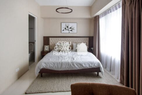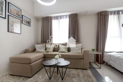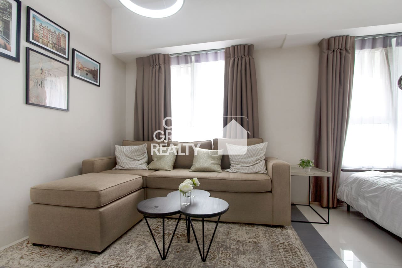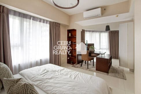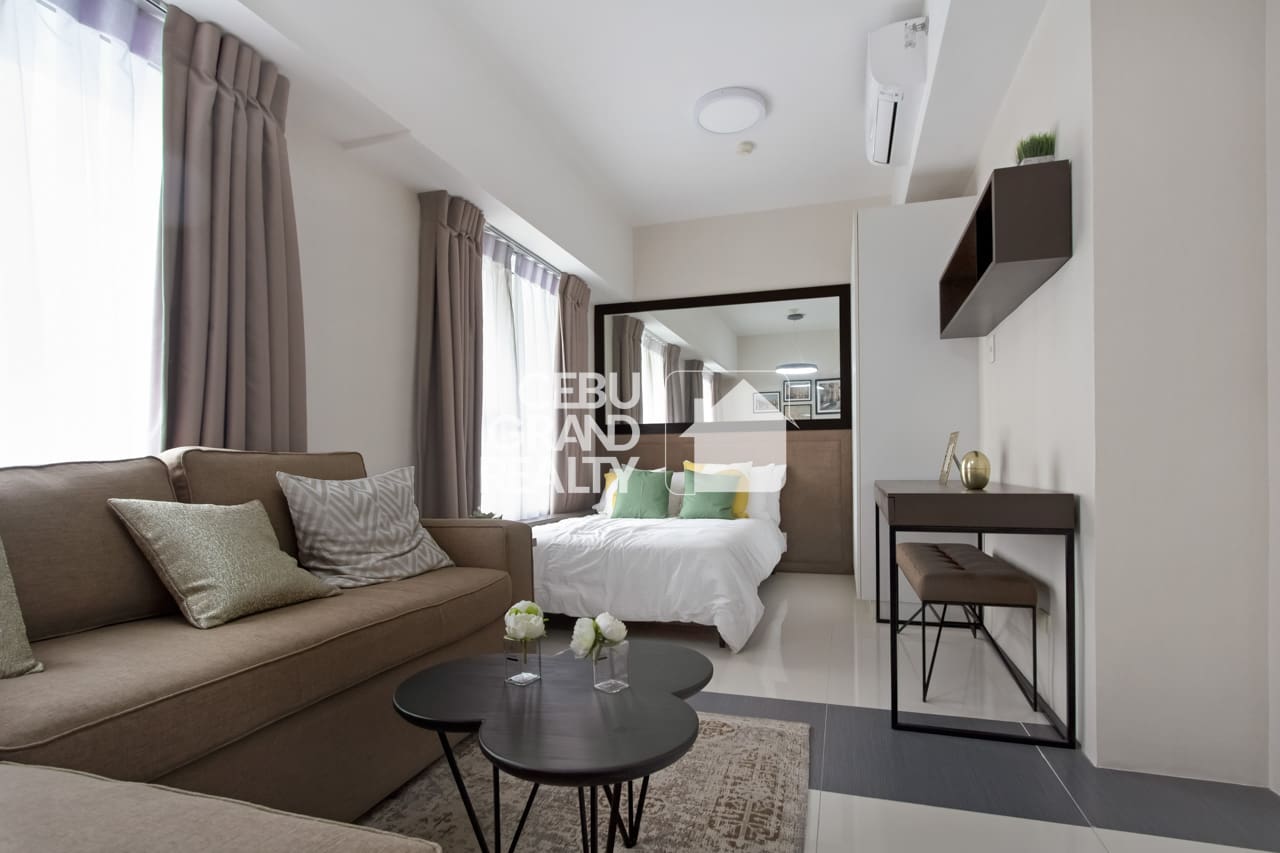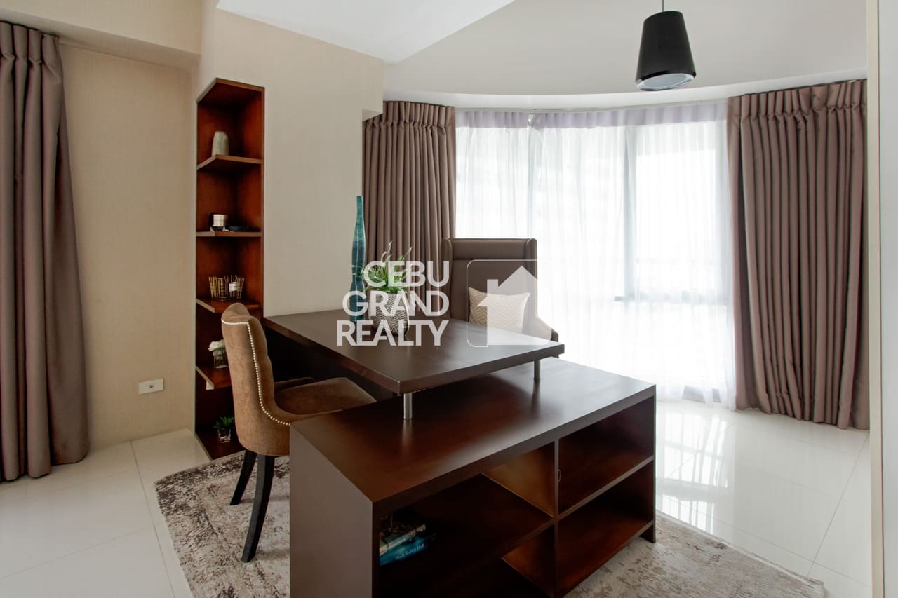 The intelligently designed open-plan layout promotes a seamless flow between the living, dining, and kitchen areas, making it ideal for both intimate relaxation and entertaining guests. The main living space is anchored by a gracefully curved sofa, a true centerpiece for conversation and comfort. In the master suite, discover a private sanctuary designed for ultimate rest, complete with a dedicated workspace for effortless productivity and an en-suite bathroom for added convenience. The second bedroom offers remarkable versatility, easily adapting as a guest room, a cozy den, or a private study. Every detail, from the cool, glossy tiles underfoot to the warmth of the wood-toned furniture, has been meticulously selected to create a cohesive and luxurious environment. This suite truly embodies what a modern condo in Cebu IT Park offers in terms of style and functionality.