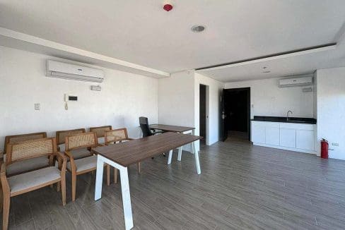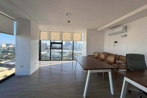 Step into this Modern Office Space with City Views for Rent in Meridian by Avenir, where natural light floods the room through large floor-to-ceiling windows, offering breathtaking panoramic views of the city skyline. With a minimalist design featuring sleek wooden desks, air conditioning, and tiled flooring, this office is the perfect blend of comfort and style. It comes fully equipped with a private kitchenette and restroom, ensuring that your team has everything they need without stepping out of the office.