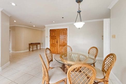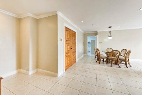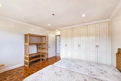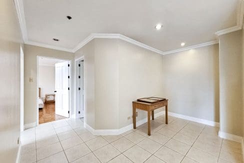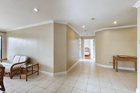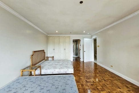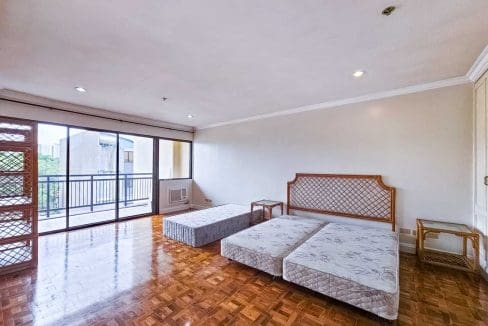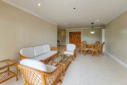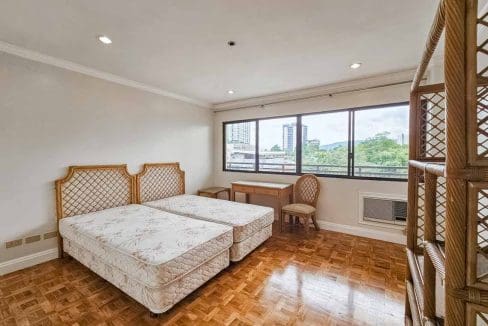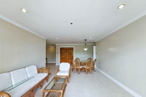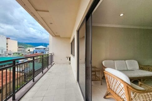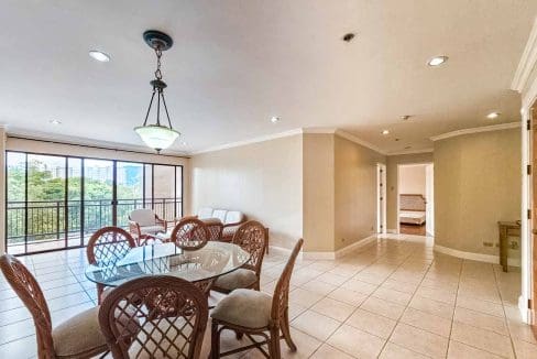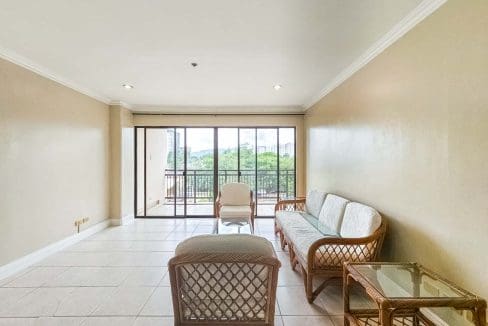 Step into this spacious condo with balcony in central Cebu City, where natural light floods an open-plan living and dining area, complemented by elegant parquet flooring and comfortable wicker furnishings. The sliding glass doors lead to a private balcony, offering serene green views—the perfect spot to unwind or entertain. With built-in storage and large closets, this three-bedroom condo for rent with natural light in Cebu is designed for both comfort and functionality, making it ideal for modern living.