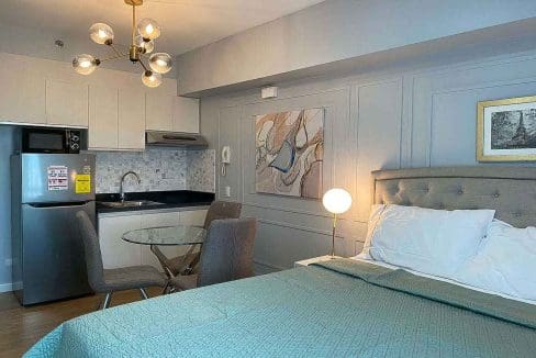 Discover modern living in this Modern Studio Apartment for Rent in Solinea, located at the heart of Cebu Business Park. This fully furnished studio boasts a stylish and comfortable sleeping area with an upholstered bed, alongside an open dining space featuring a glass table and cushioned chairs. The compact kitchen is designed for convenience, equipped with sleek white cabinetry, a stainless steel refrigerator, microwave, and built-in cooktop – perfect for preparing light meals at home. Soft neutral tones and sophisticated lighting create a bright, welcoming ambiance, enhanced by large windows with tasteful curtains.