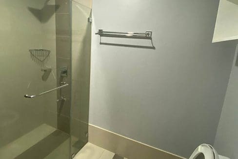 The bathroom completes the unit’s modern appeal, featuring a glass-enclosed shower, wall-mounted toilet, and minimalist fixtures. This Modern Studio Apartment for Rent in Solinea is perfect for professionals or couples, offering a harmonious blend of style and functionality in one of Cebu’s most desirable locations.
