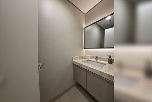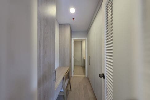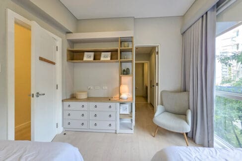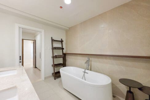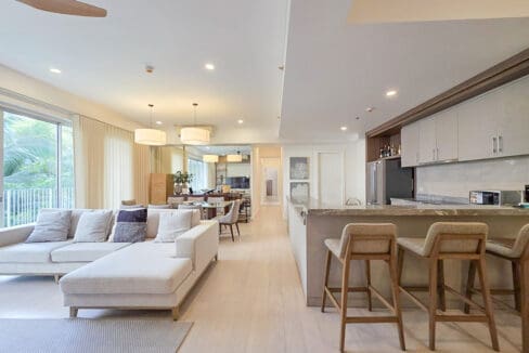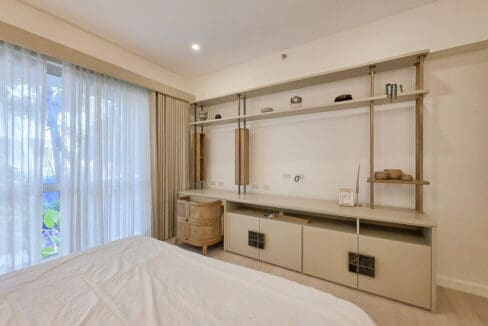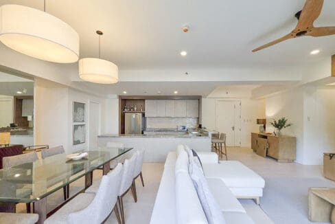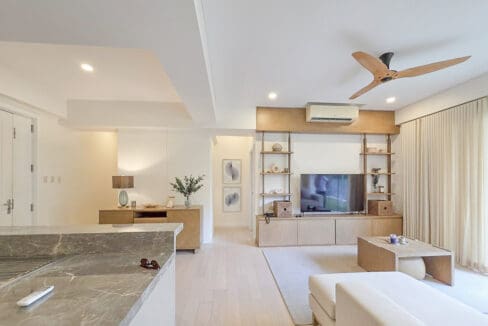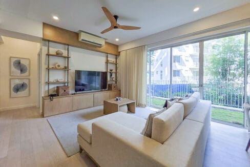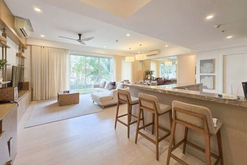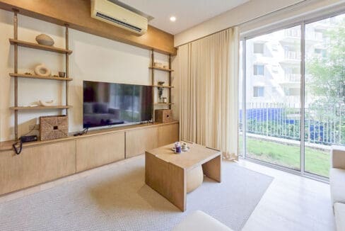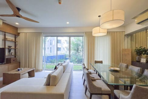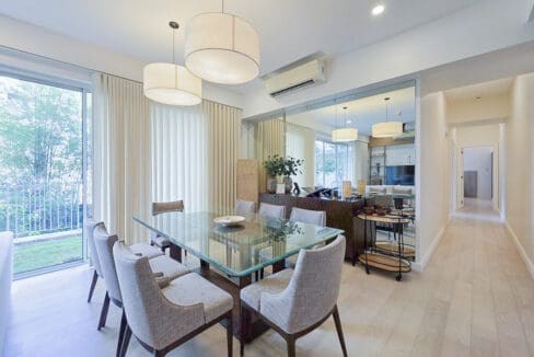 The dining area, framed by large mirrors and floor-to-ceiling glass doors, creates a sense of openness and fluid connection to the lush greenery outside. This is not just a unit; it’s a curated lifestyle that embodies serene living redefined with timeless interior style, where every detail supports a calm and harmonious ambiance.
