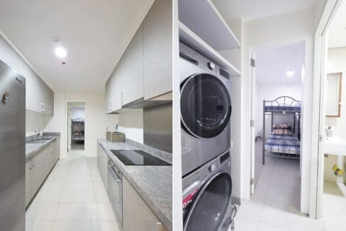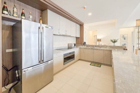 • Built-in oven, induction cooktop, and stainless steel refrigerator