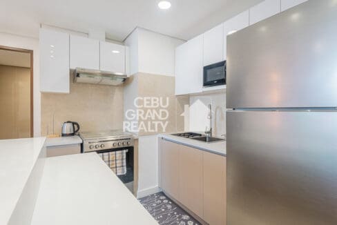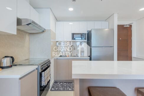 The kitchen balance’s function and aesthetics with sleek countertops, built-in cabinetry, and a complete set of appliances including a microwave, electric stove, and a refrigerator. The breakfast counter with bar stools is ideal for quick meals or casual conversations.