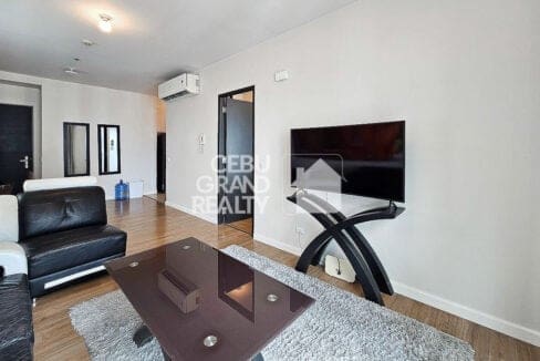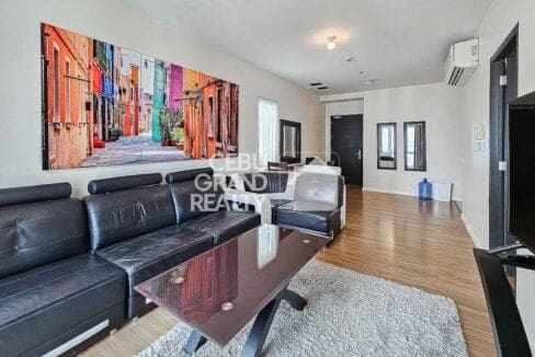Experience contemporary urban living in this Stylish and Fully Furnished 1 Bedroom Condo in Solinea, located in the heart of Cebu Business Park. This unit features a spacious living area with large windows that offer stunning city and sea views, complemented by a modern black-and-white leather sectional sofa and vibrant wall art. The open-plan design integrates a cozy dining space, perfect for intimate meals.