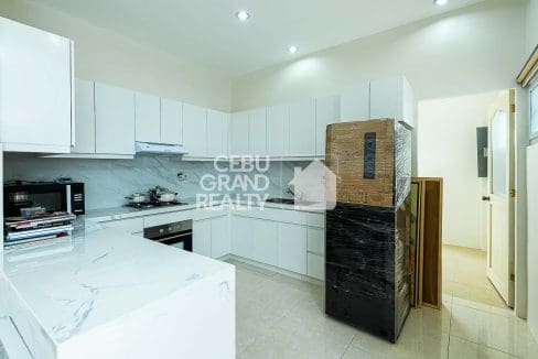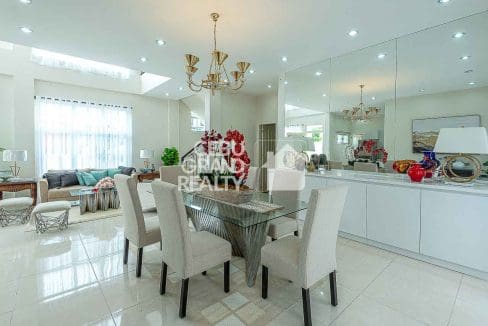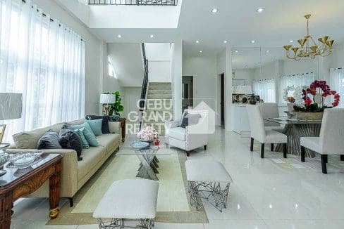Welcome to your dream home in Cebu! This modern spacious family home with elegant design offers luxurious living with its open-plan layout and abundant natural light. The living area features a beige sofa with grey and blue cushions, a unique geometric glass coffee table, and large windows with sheer curtains. The newly constructed kitchen boasts pristine white cabinetry, marble countertops, and state-of-the-art appliances, perfect for both everyday meals and entertaining guests.