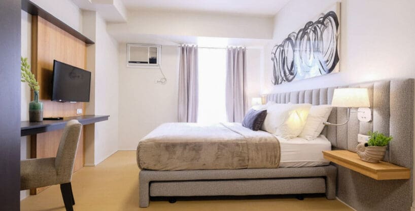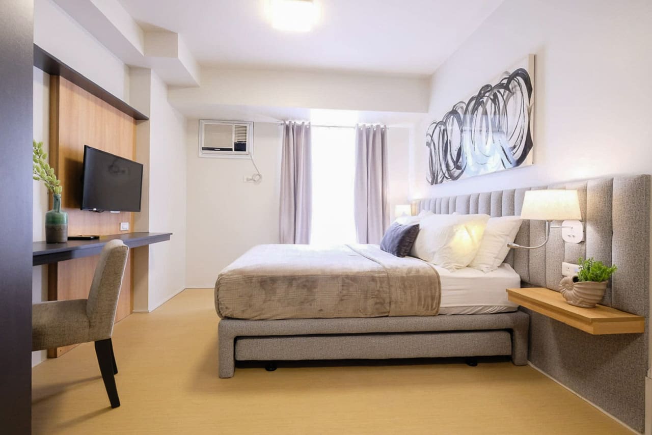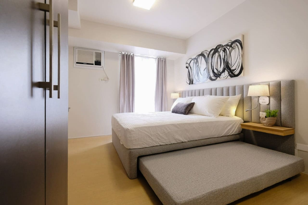 This stylish furnished studio with modern interiors features a cushioned bed with a pull-out trundle, ideal for guests or maximizing sleeping space. Built-in floating nightstands, ambient wall lamps, and a tufted headboard elevate the sleeping area, while blackout curtains ensure restful nights. A minimalist abstract artwork adds a touch of modern flair above the bed.