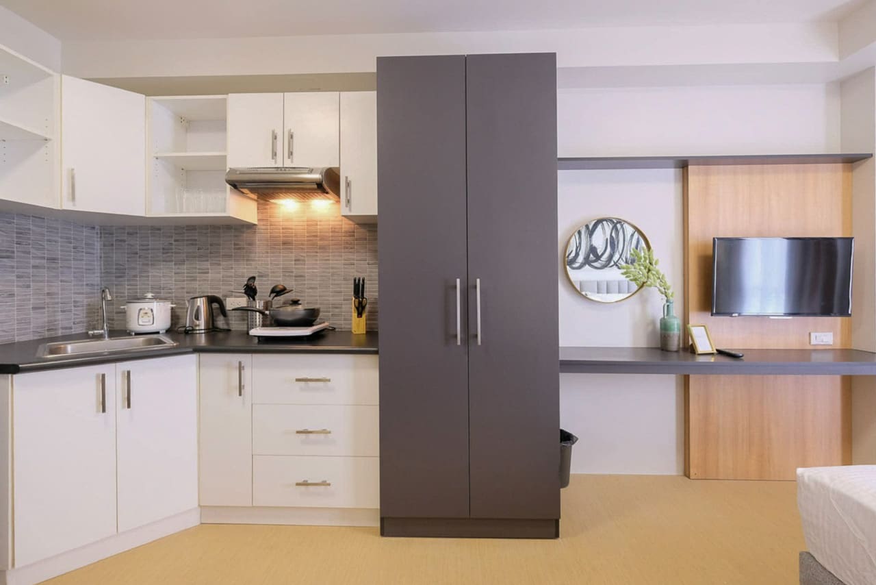 The kitchenette in this stylish furnished studio with modern interiors is equipped with essential appliances including a rice cooker, kettle, induction cooktop, range hood, and generous cabinet storage. The modern tile backsplash and under-cabinet lighting further accentuate its clean design.