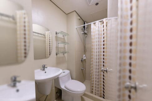 • Toilet and shower area with curtain divider and water heater