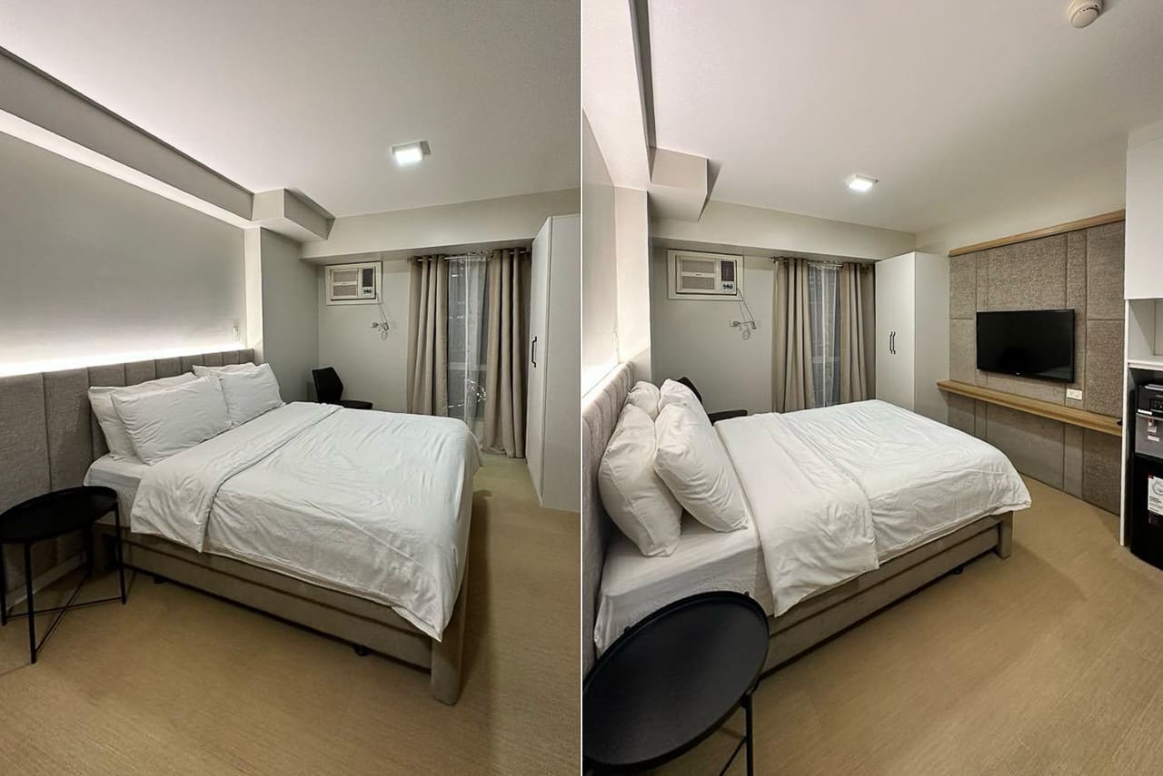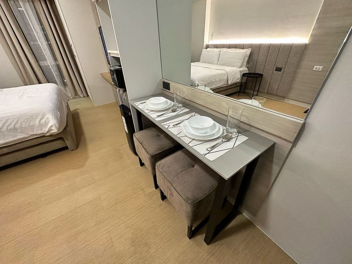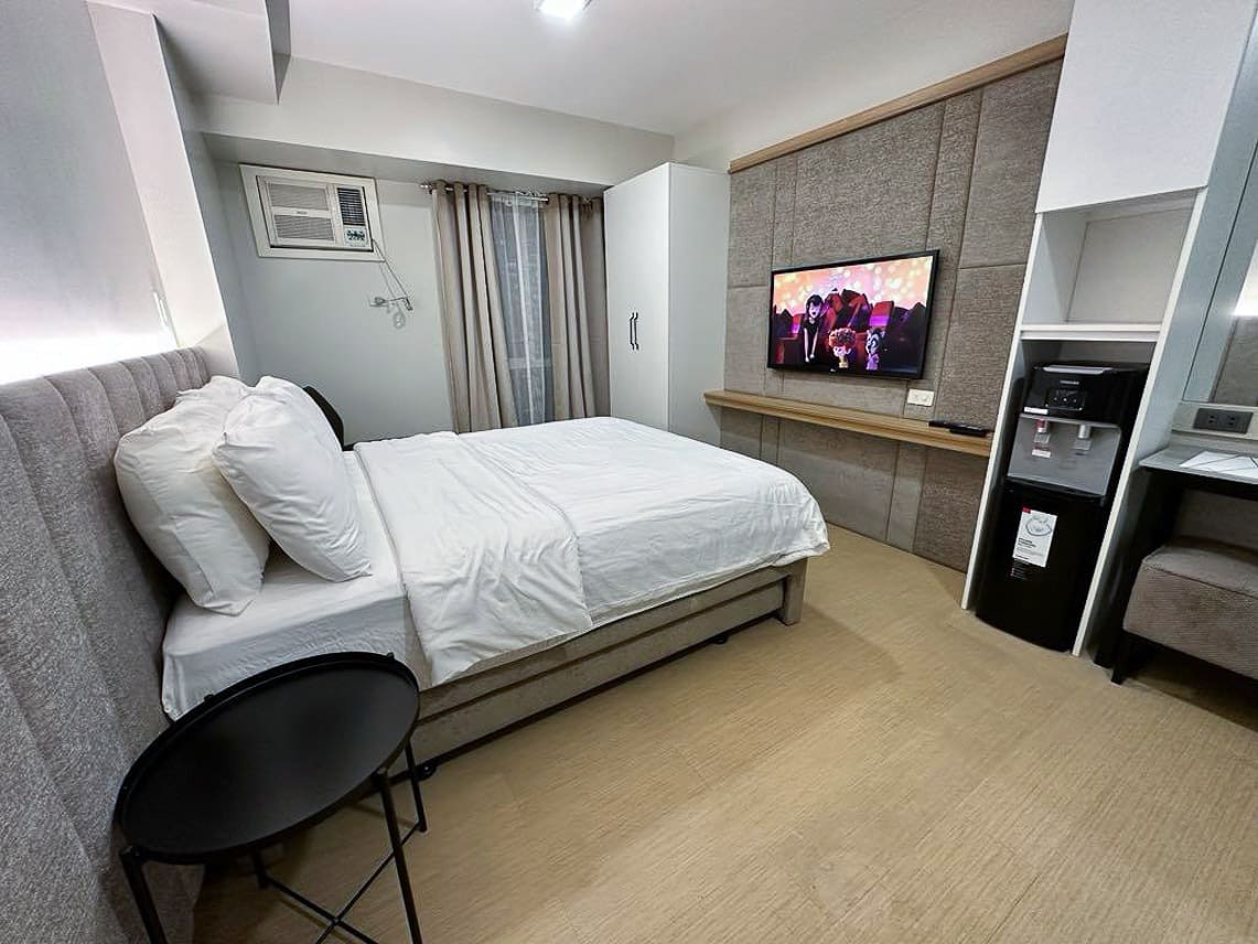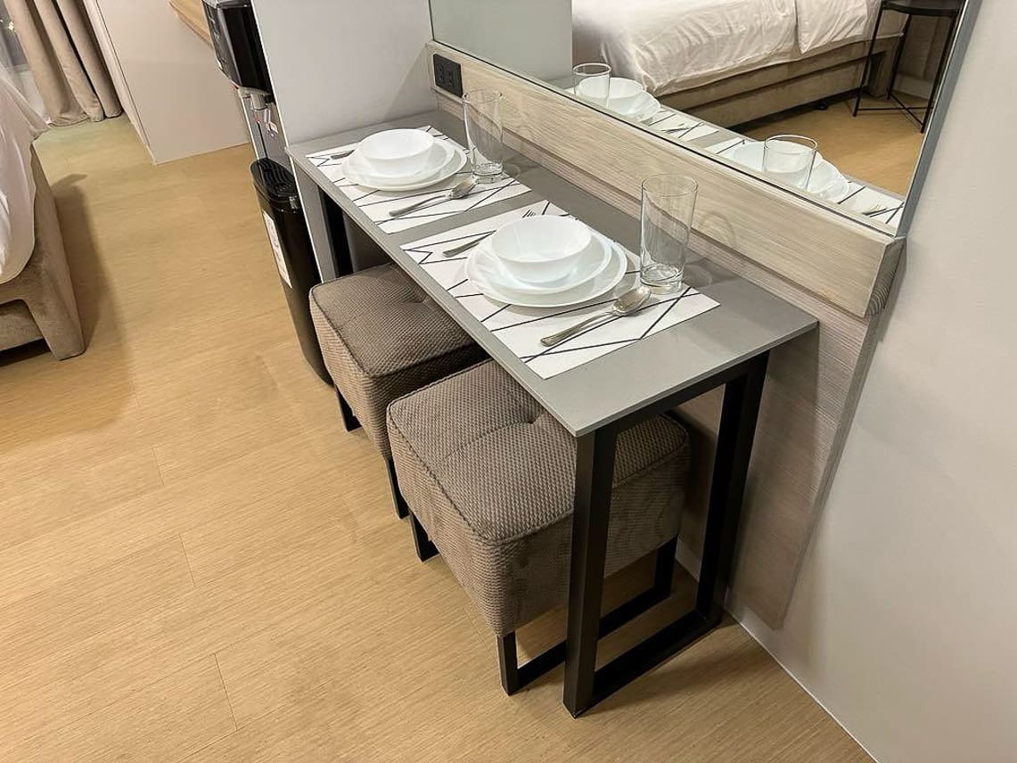 Designed to maximize space without sacrificing comfort, the studio features a plush bed, sleek dining area, and a fully functional kitchen equipped with modern appliances. The neutral palette and minimalist furnishings create a calming atmosphere, making it easy to personalize the space according to your taste. With a cozy entertainment wall and a work-friendly dining nook, this Sunlit Minimalist Oasis for Dynamic Lifestyles adapts seamlessly to your daily needs.