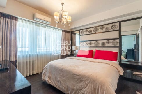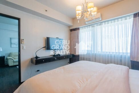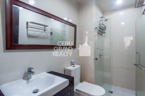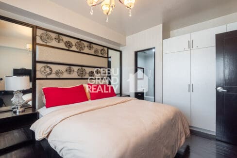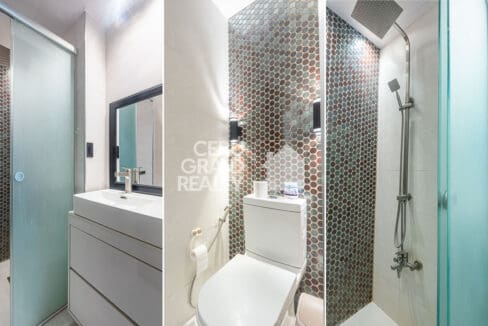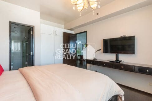 Retreat to the serene master bedroom with its king-sized bed, contemporary headboard, and ample wardrobe space. The suite bathroom is outfitted with a glass-enclosed shower, elegant fixtures, and a large mirror, continuing the condo’s sleek design.