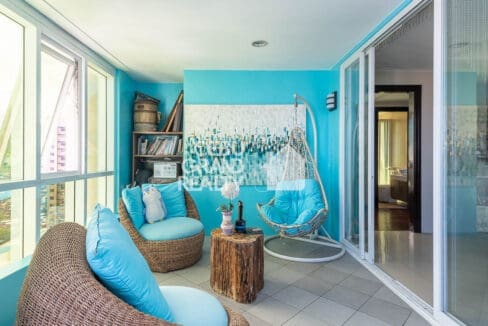 Step into the well-equipped kitchen, complete with wooden cabinetry, a modern backsplash, and essential appliances, making meal preparation a breeze. The dining area, with its sleek glass-top table and high-back chairs, offers a stylish space for entertaining guests. Meanwhile, the balcony-turned-sunroom is a true highlight, featuring rattan furniture, a hanging chair, and vibrant blue walls that create a relaxing retreat with breathtaking city views.